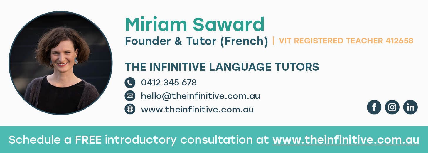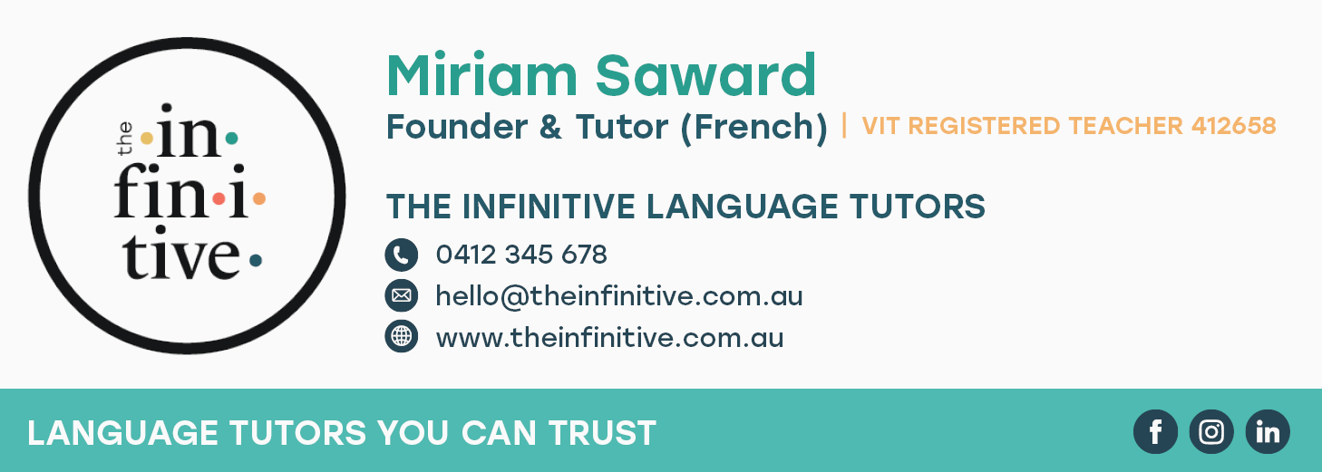The Infinitive Language Tutors is a Victoria-based tutoring business specialising in French and English language education for secondary school students. They offer personalised online learning through one-on-one sessions, as well as interactive workshops and informative masterclasses, all of which are aligned with the VCE curriculum. This ensures students receive thorough preparation and approach their exams with confidence.