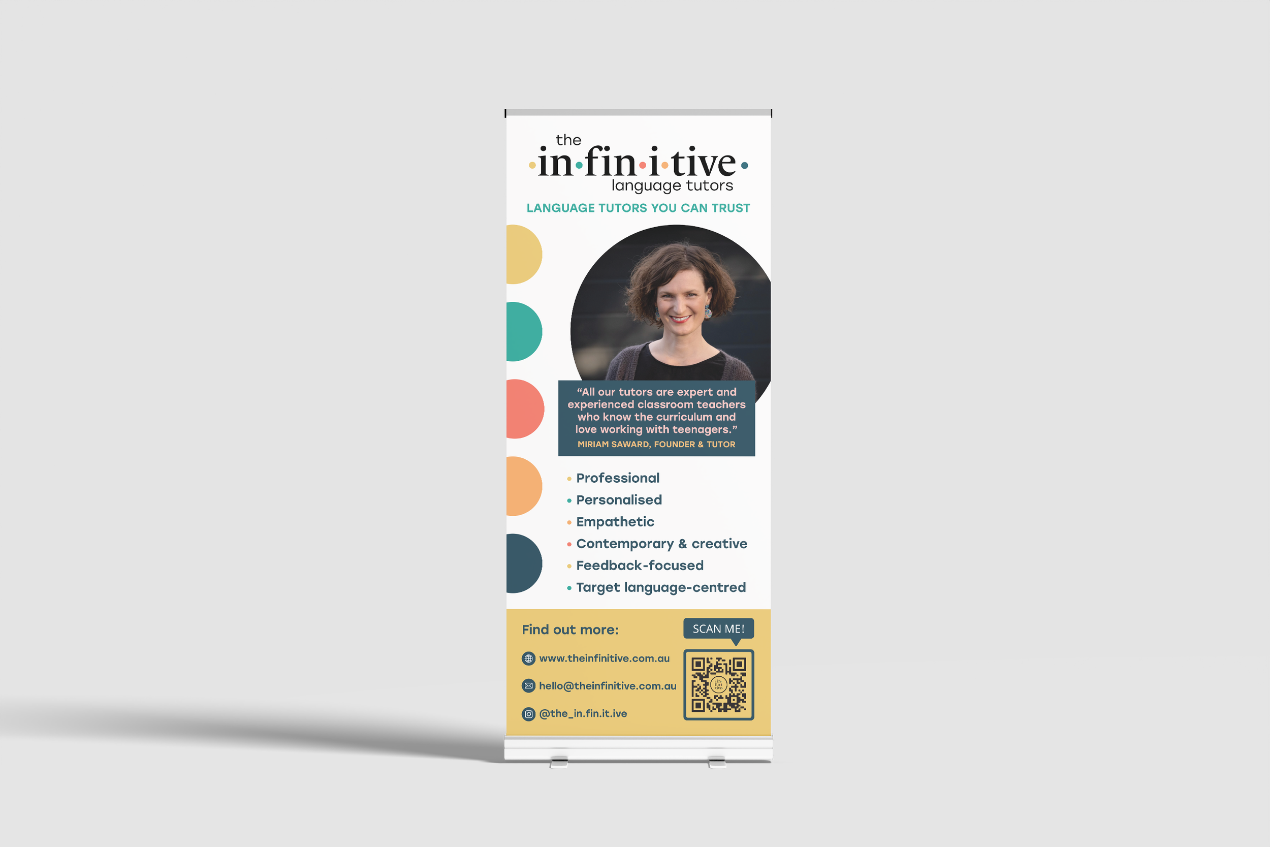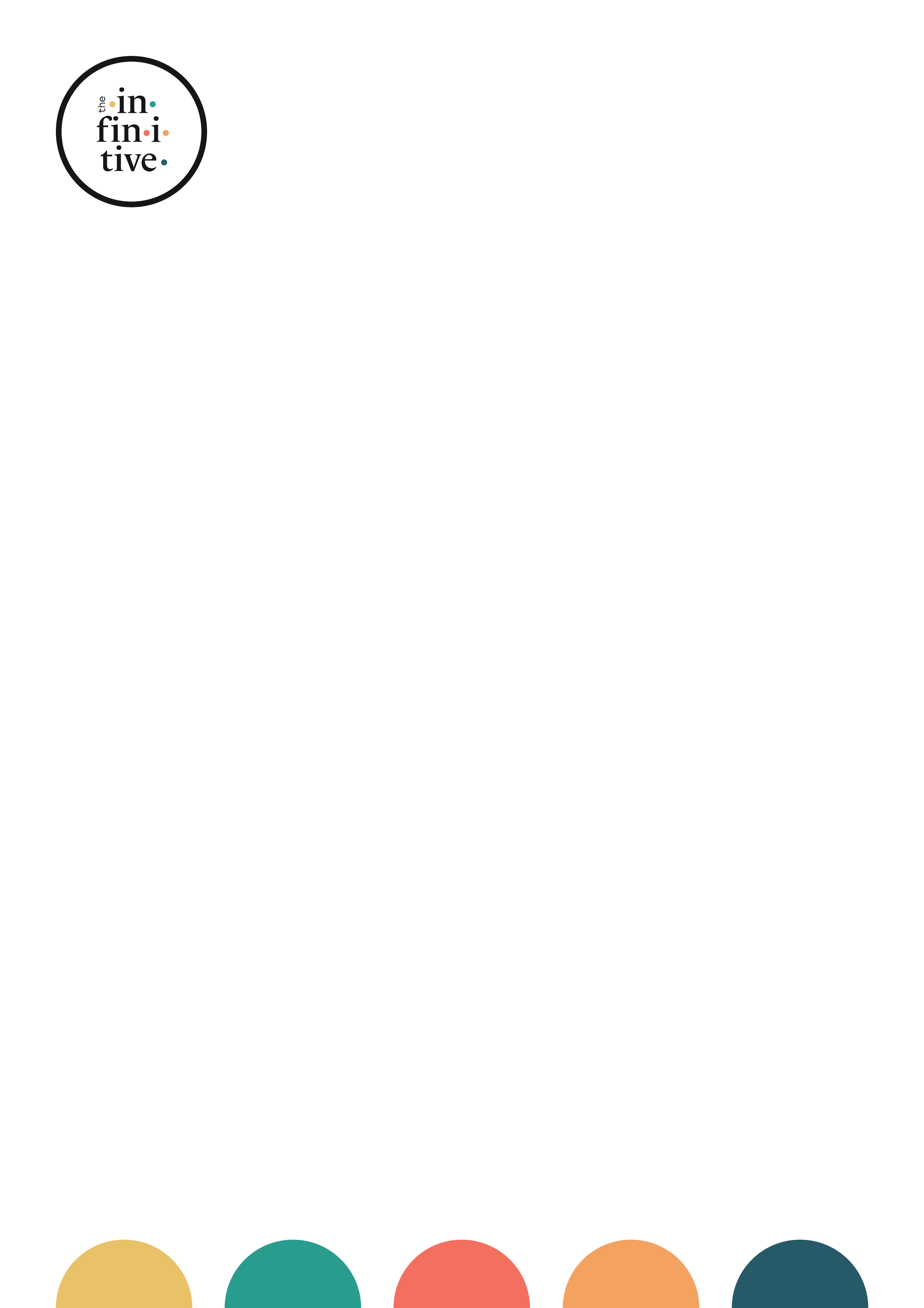 The Infinitive Dots appear subtly in the footer, adding brand presence and colour while keeping the design practical and unobtrusive.